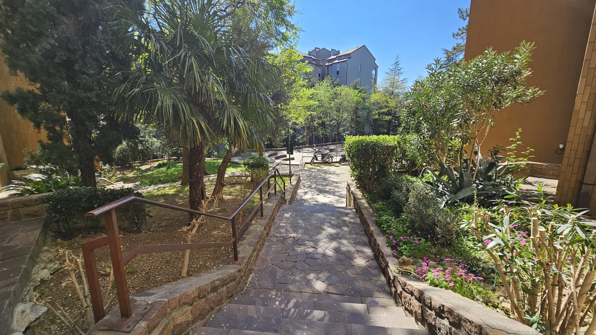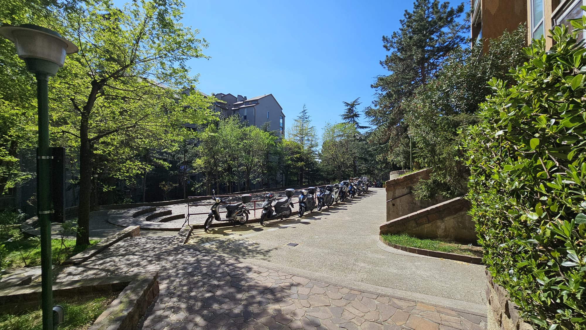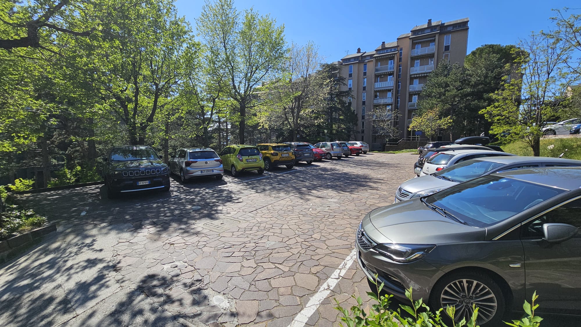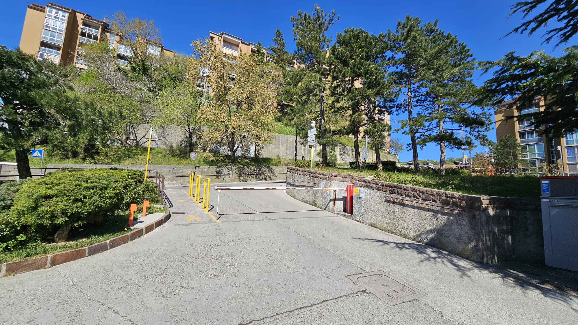 Parcheggio condominiale delimitato da sbarra automatizzata.