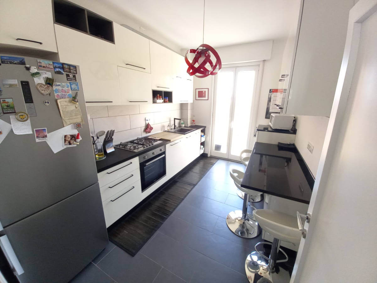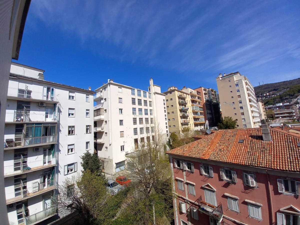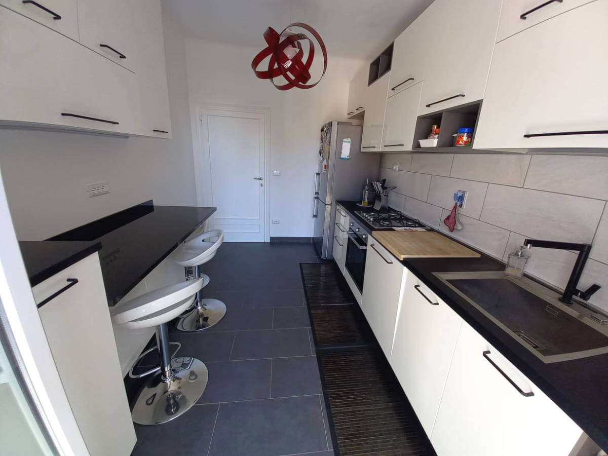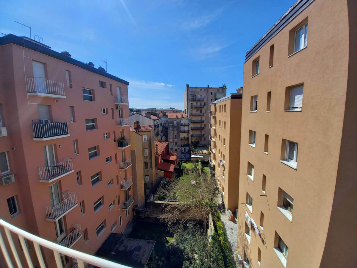 L’alloggio molto luminoso situato al quinto piano di uno stabile servito da ascensore, si compone da ingresso, grande soggiorno molto luminoso con vista aperta, cucina abitabille con poggiolo, due stanze matrimoniali di cui una gode di grande poggiolo, stanza singola/studio e due bagni finestrati ristrutturati con gusto.